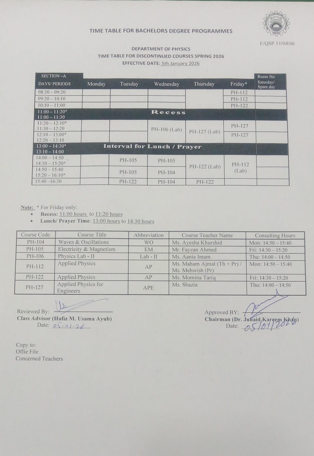 The Department of Physics is dedicated to promoting academic excellence, advancing high-quality research, and developing future leaders in the field of physics. Our academic programs provide students with a comprehensive foundation in fundamental physics while fostering critical thinking, analytical reasoning, and problem-solving skills essential for scientific inquiry and technological progress. Graduates of the Department have established distinguished careers in academia, research institutions, and a broad spectrum of industries, including energy, healthcare, aerospace, and data science. These accomplishments are a testament to the commitment, expertise, and scholarly contributions of our faculty members, whose research encompasses diverse areas such as quantum physics, medical physics, environmental and climate studies, materials science, and computational physics. To remain aligned with national priorities and international scientific advancements, the department continuously reviews and enhances its academic curricula and research activities. This ensures that our graduates are well prepared to address emerging scientific challenges and to contribute effectively to innovation and societal development. Whether pursuing careers in research, industry, or education, students benefit from a rigorous and supportive academic environment that promotes excellence and professional growth. We look forward to welcoming you to the Department of Physics and to supporting your academic and professional aspirations. Dr. Junaid Kareem Khan Chairman, Department of Physics |